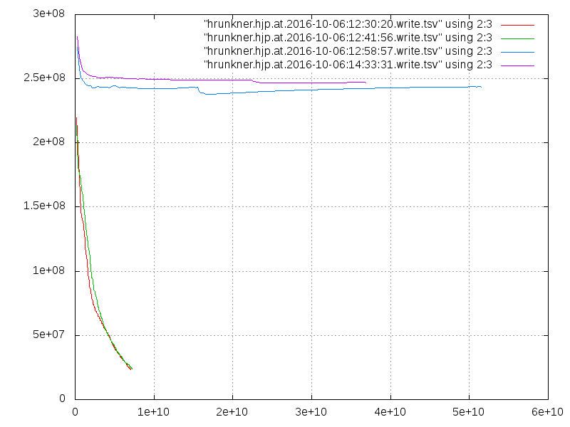 Much better. The write performance is now almost constant at 250 MB/s. A bit surprisingly, it is even slightly better on the filled filesystem (purple) than on the freshly created empty filesystem (blue).